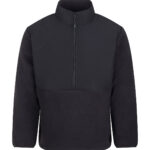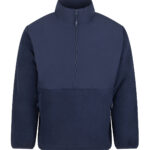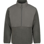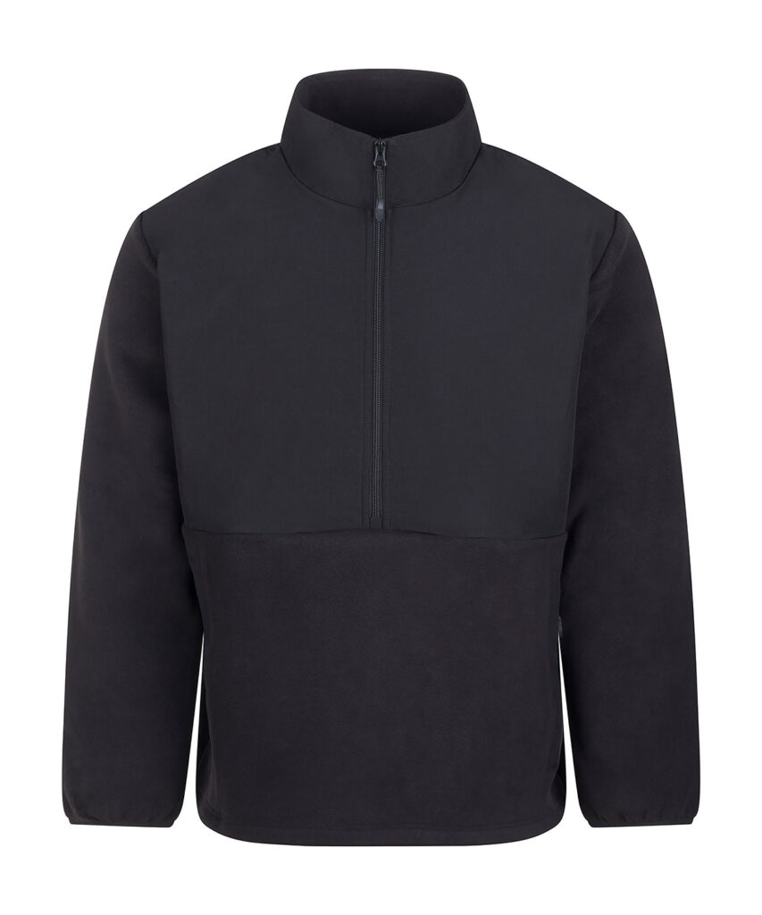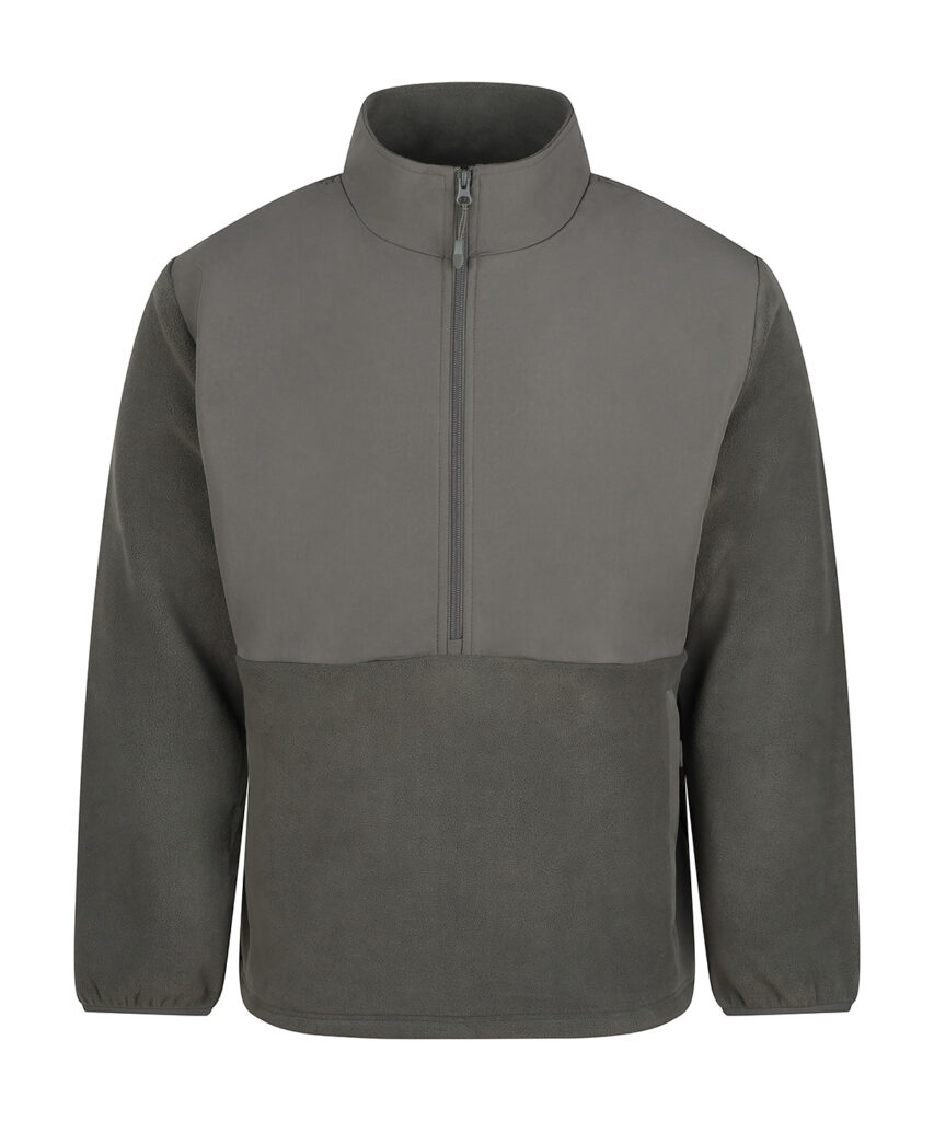 1/2-zip styling. Microfleece fabric with ripstop fabric overlay on upper torso front, back and collar. Centre front zip with bottom zip garage. Two side welt pockets with an inner kangaroo pocket. Stretch binding on the cuff opening. Adjustable hem with elastic and toggles. Tag-free for easy rebranding. Made from 100% recycled polyester.