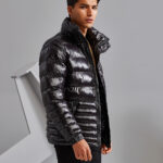 Wide external central storm flap with concealed coil zip, signature zip puller and internal storm flap with chin guard. Chunky rubberised stud fastenings on centre front. Horizontal stitched graded baffles. 245gsm polyester fill. Fully-lined in polyester matt finish. Self elasticated cuffs. Tonal coil zipped pockets with upper zip guard and self fabric piping around edges with rubberised edge trim. Glossy high shine face fabric. Internal double jet chest zipped reverse coil pocket. Product contains no branded neck label.* Removable Kimble or looped garment tags. Inner seam label holds important product information on one label with a second label containing brand information which can be cut-away.