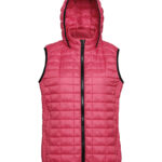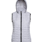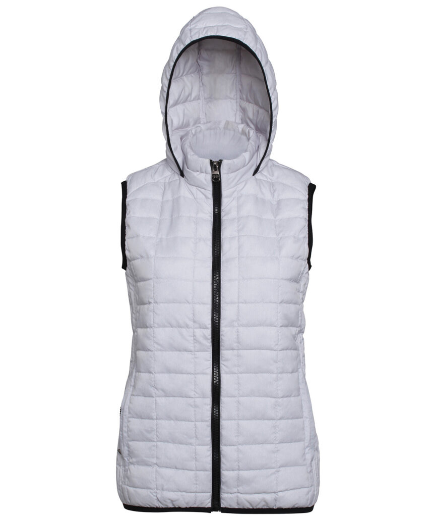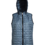 Contrast coil zip on centre front with signature zip puller and mouse tail piping on each side of zip opening. Front and back square stitched baffles with linear side narrow baffles. 250gsm lightweight polyester fill. Fully-lined in tonal polyester. Inset welt pocket with concealed zip opening and double zip garages. Contrast stretch binding on hem, armholes and hood opening. Internal piping around inside facing. Secure hood attached to collar. Internal welt pocket. Internal zipped opening on back panel for embroidery access. Product contains no branded neck label.* Removable Kimble or looped garment tags. Inner seam label holds important product information on one label with a second label containing brand information which can be cut-away.