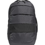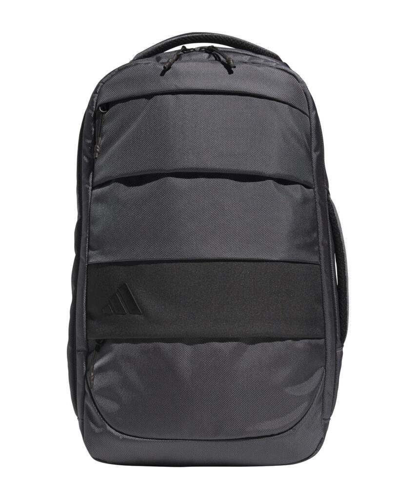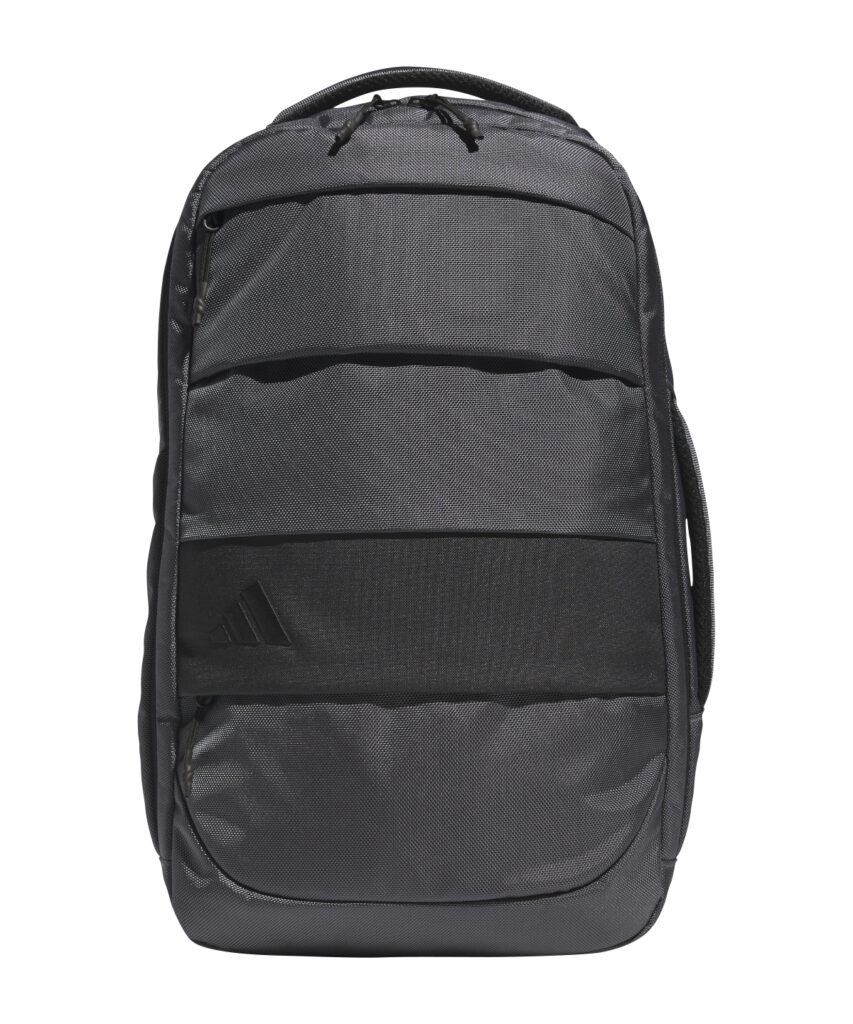 A multipurpose day pack for golfers made in part with recycled materials. Front zip and slip-in side pockets. Laptop sleeve and padded adjustable shoulder straps with chest strap. Top and side carry handles.