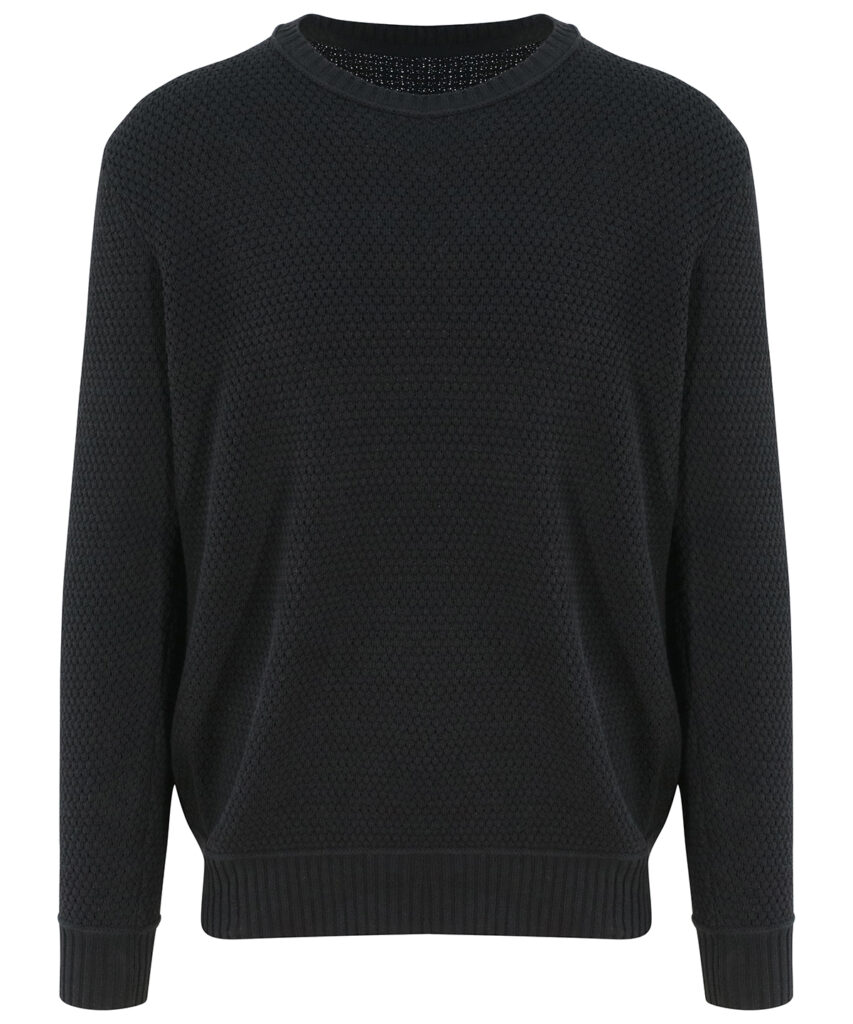 Regenerated cotton blended with recycled polyester sweater. Seed stitch knit with rib neck, cuffs and hem.