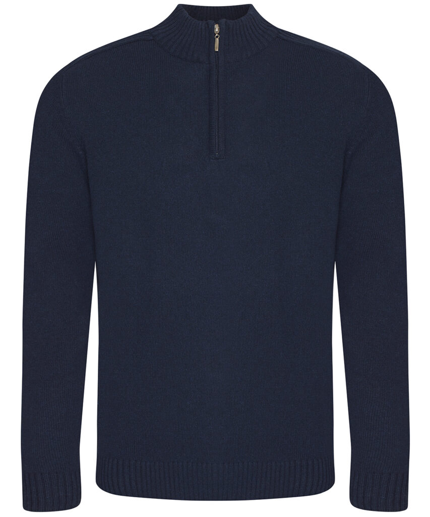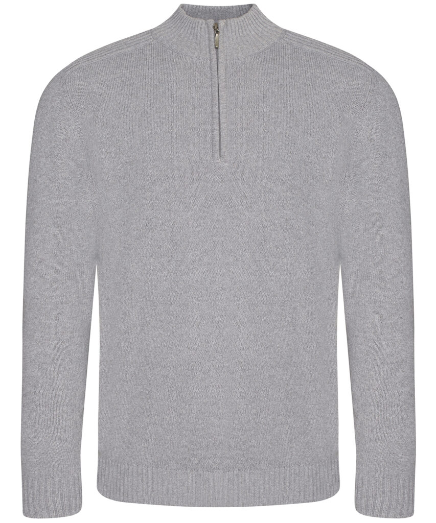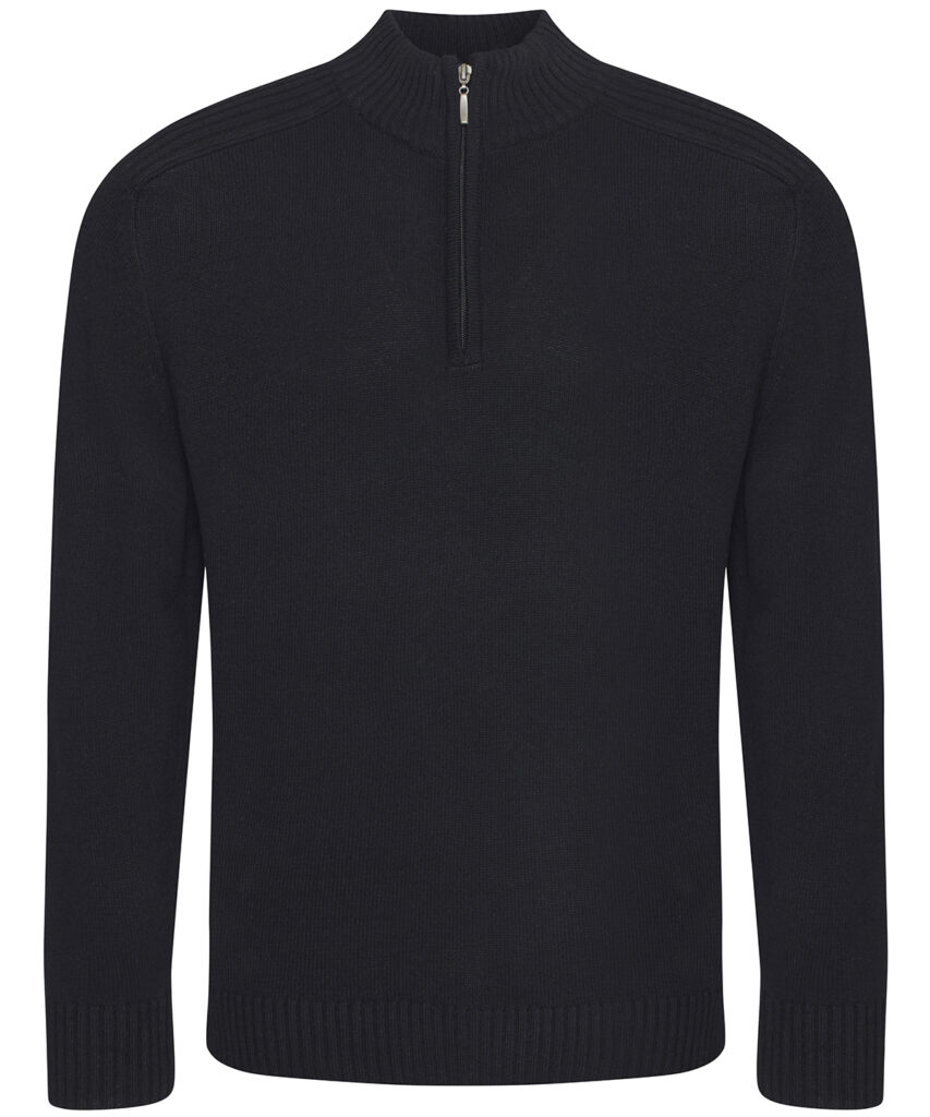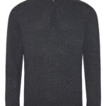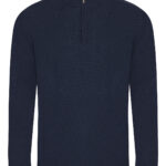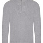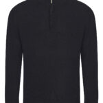 Long sleeve sweater made from regenerated cotton with tall collar and zip neck. Contrast rib stitches at shoulders cuff and hem.