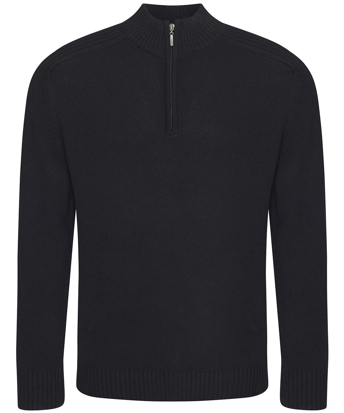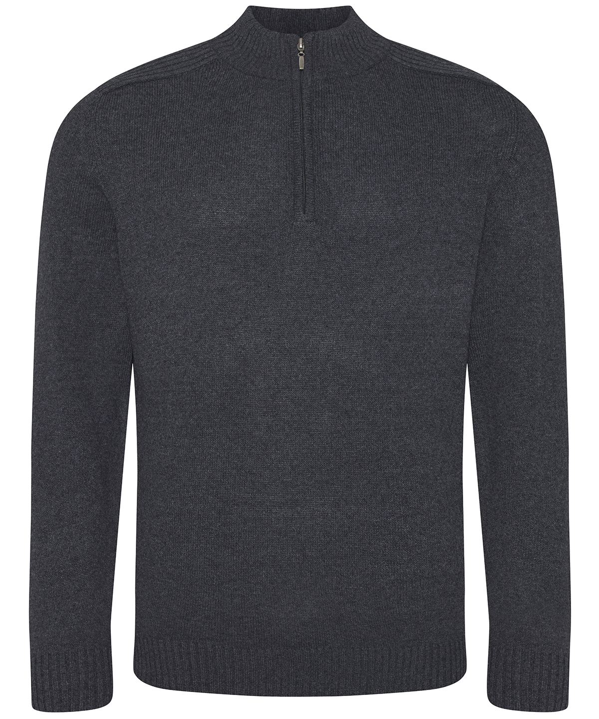 Long sleeve sweater made from regenerated cotton with tall collar and zip neck. Contrast rib stitches at shoulders cuff and hem.