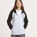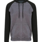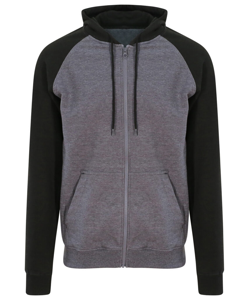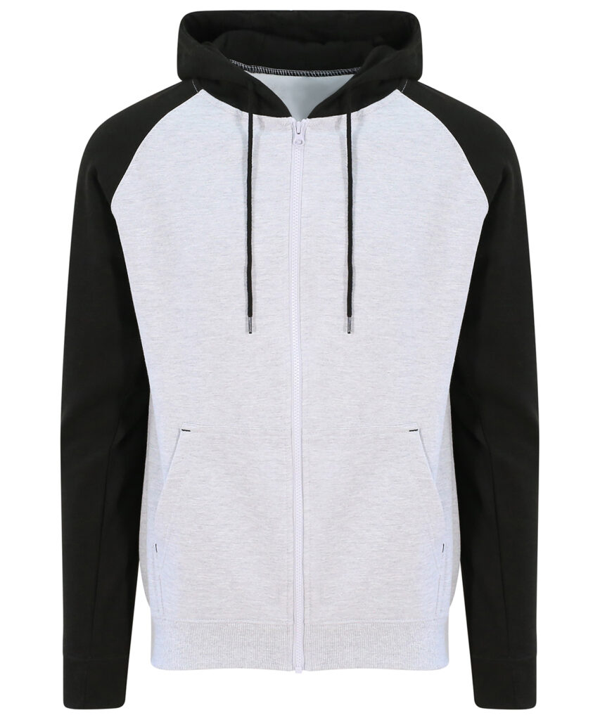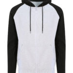 Twin-needle stitching detail. Contrast raglan sleeves. Double fabric hood. YKK plastic zip. Contrast flat lace drawcords. Spilt kangaroo pocket. Ribbed cuffs and hem. Soft cotton faced fabric creates ideal printing surface. Simple tear-out label makes it perfect for rebranding. Brushed inner fleece.
