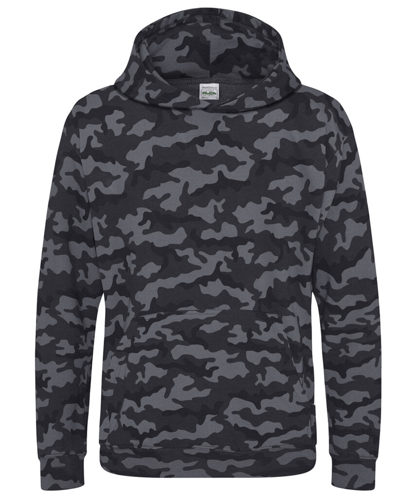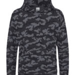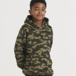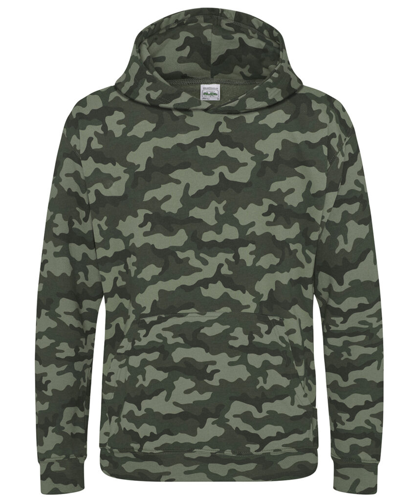 Classic all-over camouflage print design. Double fabric hood. Twin-needle stitching detail. Kangaroo pouch pocket. No drawcords – to comply with EU regulations. Brushed inner fleece. Ribbed cuffs and hem. Soft-cotton faced fabric creates ideal printing surface. Simple tear-out label makes it perfect for rebranding.