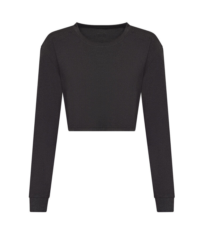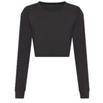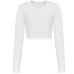 Cropped womens fit with side seams. Long sleeves with cuffs. Size label only, for easy rebranding colour-coded white for women. Triblend fabric for style and comfort. Surface excellent for print or embroidery. Ribbed crew neck style, with taped neck. Twin-needle stitching detail on sleeve and bottom hem.