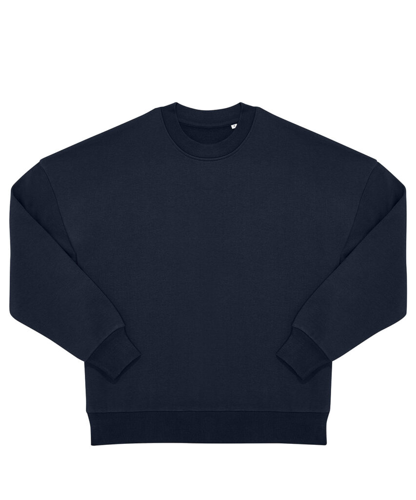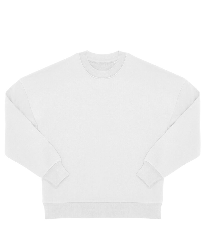 True unisex style with side seams. Durable 350gsm fabric with a sturdy, substantial hand feel. B&C PST (Perfect Sweat Technology). Low shrinkage fleece (LSF). 100% cotton face for perfect printability. Luxurious hand feel. Dropped shoulder and oversized feel for a relaxed fit. High-quality cuffs and bottom hem in 1×1 rib. Curated colour palette to serve POD, influencer and music merch, fashion and retail/e-tail, workwear and academic segments. B&C No Label solution for easy rebranding. Contains recycled polyester.