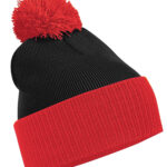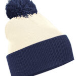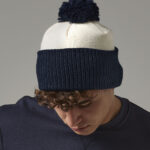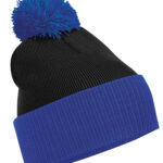 Double layer knit. Dual style – cuffed or slouch. Ribbed cuff. Contrasting pom pom and cuff. Reach certified.