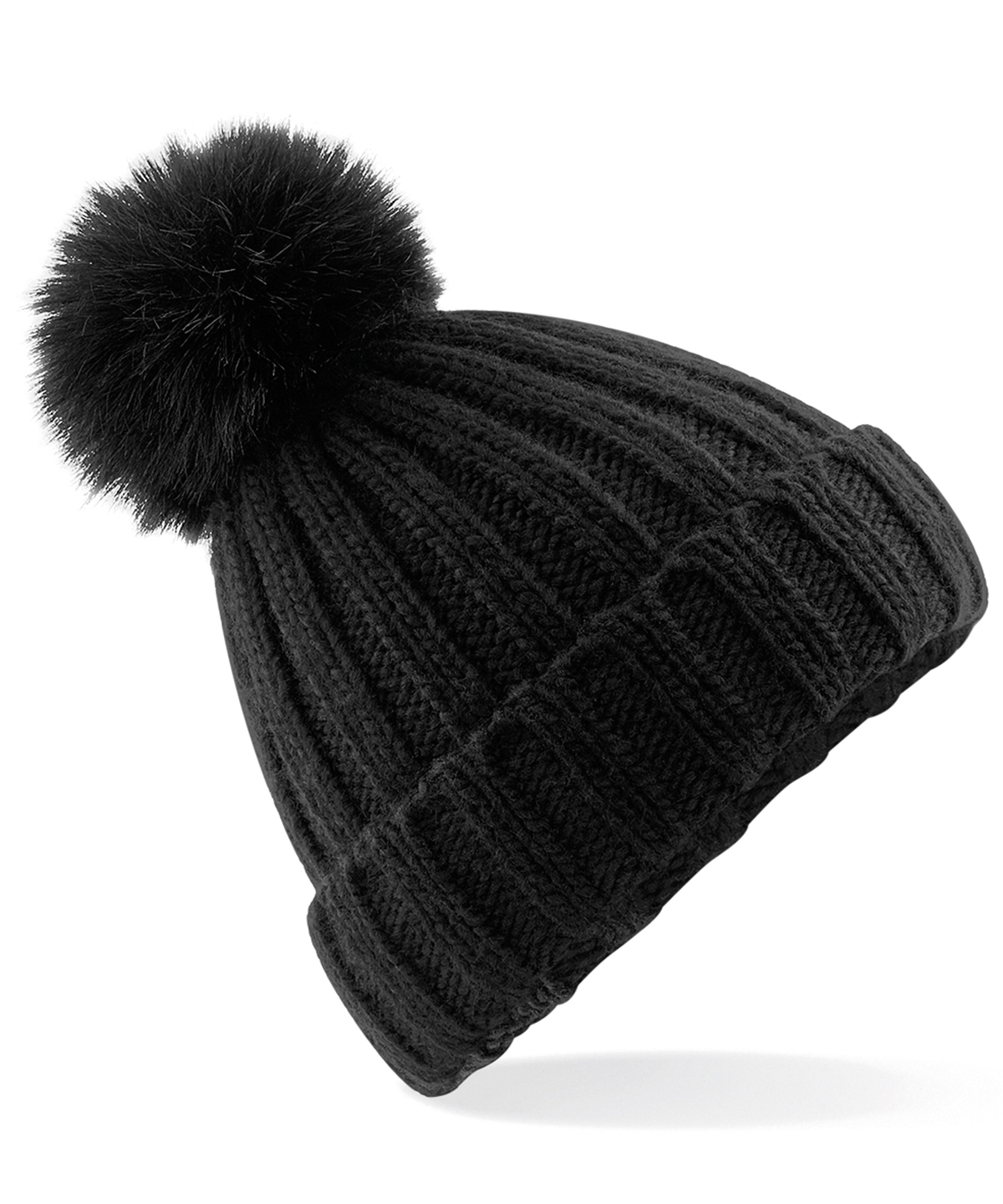 TearAway label for ease of rebranding. Luxury self-coloured faux fur pom pom. Removable pom pom for ease of washing. Unisex styling. Cuffed design for optimal decoration. Sumptuous heavy ribbed knit. BSCI certified. Reach certified.