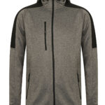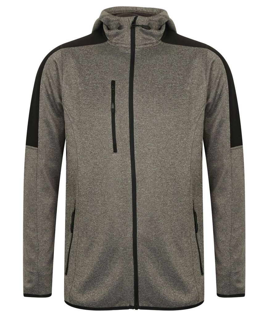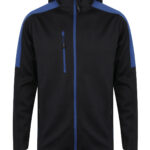 Contemporary softshell jacket with 3 piece hood. Contrast colour panelling on shoulders and upper sleeve. Soft-touch Jersey fabric with bonded microfleece reverse. Zipped chest and side pockets and contrast colour centre front zip with non-slip gripper zip pulls. Side body panels with topstitching. Dropped back hem. Stretch binding at cuffs and hem. Set-in sleeves. BSCI certified.