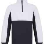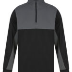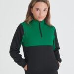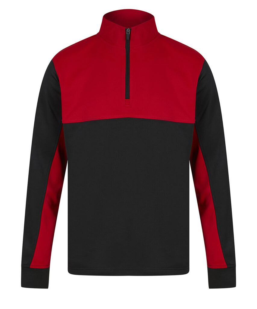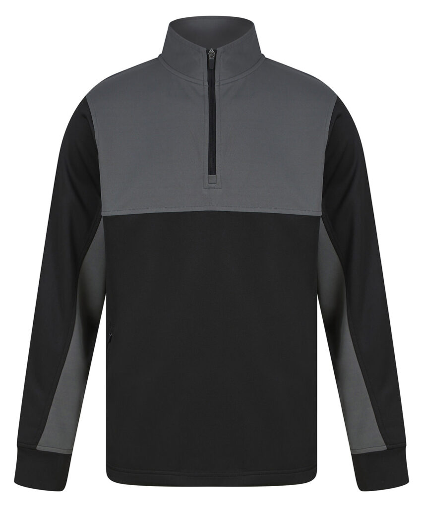 Contrast upper chest and underarm panels. Quarter zip. Side panels. Reverse nylon zips centre front and side pockets. 1×1 ribbed cuff sleeve. Semi-automatic zip pull and slider. . BSCI certified.
