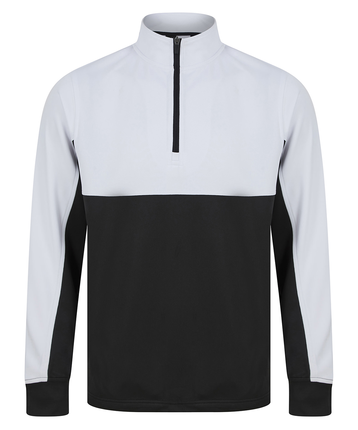 Contrast upper chest and underarm panels. Quarter zip. Side panels. Reverse nylon zips centre front and side pockets. 1×1 ribbed cuff sleeve. Semi-automatic zip pull and slider. . BSCI certified.