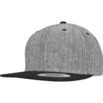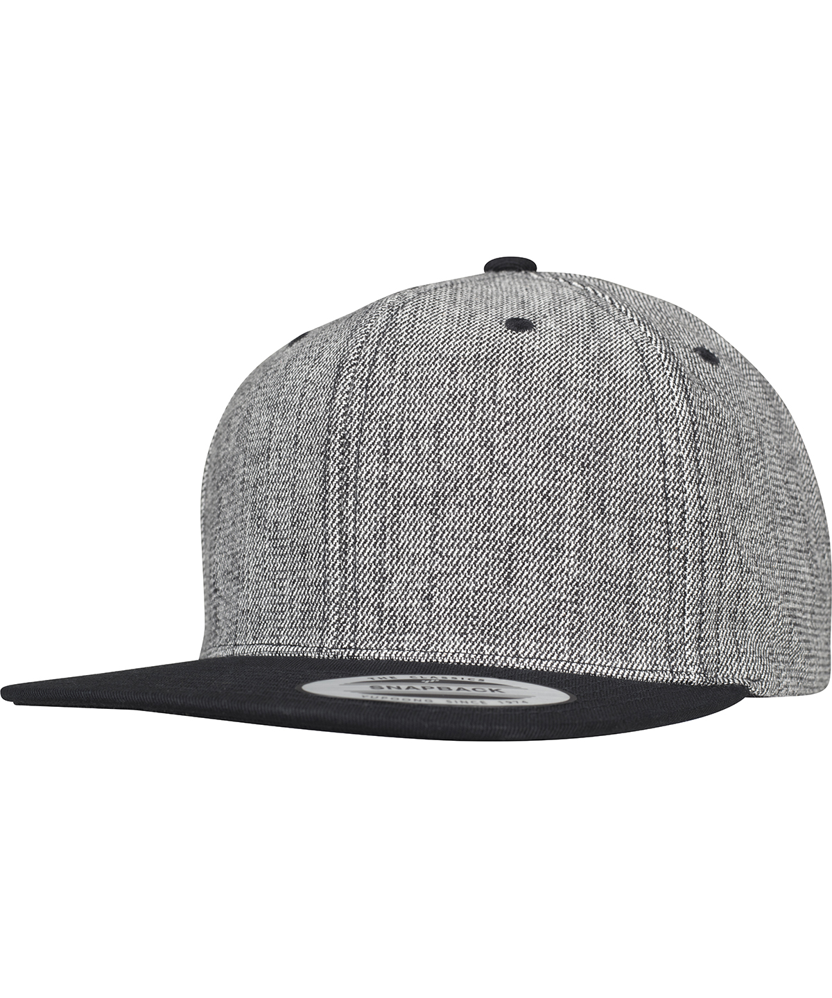 Melange solid snapback. Classy cotton twill. Fine melange look. Flat brim in black. Typical snap closure. BSCI certified. WRAP certified.