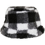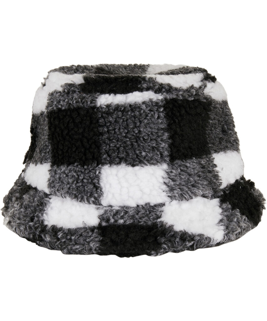 The bucket hat redesigned, featuring a fluffy sherpa fabric in polyester and acrylic and a large, harmonious check pattern. It has a slanted brim with decorative seams one size fits all.