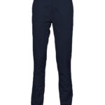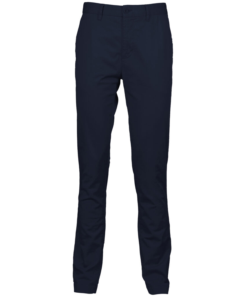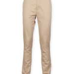 Flat front chino trouser. Tag free. Stretch fabric for ease of movement. Slanted front pockets, 2 back welt pockets, belt loops plain hem. BSCI certified.