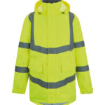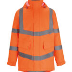 Waterproof Hydrafort 100% Polyester Oxford 300DD fabric. Medium-weight Thermoguard insulation, 100gsm. Certified to EN ISO 20471:2013 A1:2016 Class 3. Orange colourway is also certified to RIS-3279-TOM. Conforms to EN343:2019 Class 3:1. Two lower pockets. Internal pocket. Pack-away hood with adjusters. Adjustable cuffs with hook-and-loop fastening.