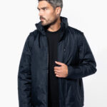 100% Polyester outer with PVC coating. Polyester padding and lining. Full-zip. Water-repellent with studded storm flap. Front pockets. Inside pocket, 1 mobile phone pocket. Detachable sleeves. Cuff adjusters with tear release fastening. Concealed hood with elasticated drawcord. Zip access for decoration. BSCI certified.
