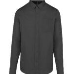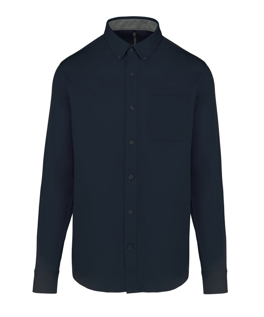 100% cotton. Twill fabric with peached soft touch. Button-down collar. Matching buttons. Chest pocket on left side. Contrast Oxford silver inner collar stand and cuffs. Back with 2 side pleats and lined yoke. Felled seam finish. Adjustable cuff with button pointed tab end. Spare button. Certifi STANDARD 100 by OEKO-TEXN CQ1007/8, IFTH.