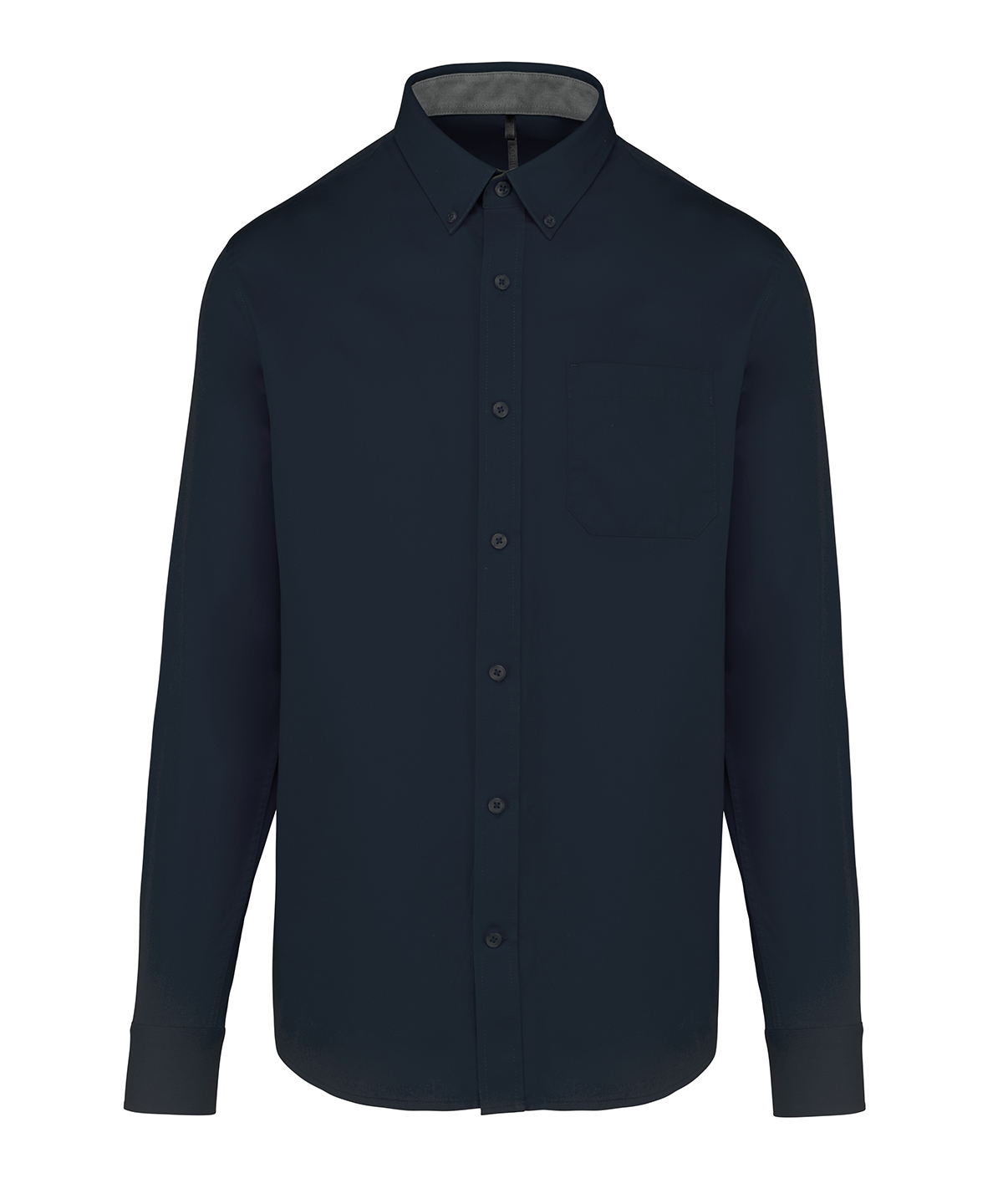 100% cotton. Twill fabric with peached soft touch. Button-down collar. Matching buttons. Chest pocket on left side. Contrast Oxford silver inner collar stand and cuffs. Back with 2 side pleats and lined yoke. Felled seam finish. Adjustable cuff with button pointed tab end. Spare button. Certifi STANDARD 100 by OEKO-TEXN CQ1007/8, IFTH.