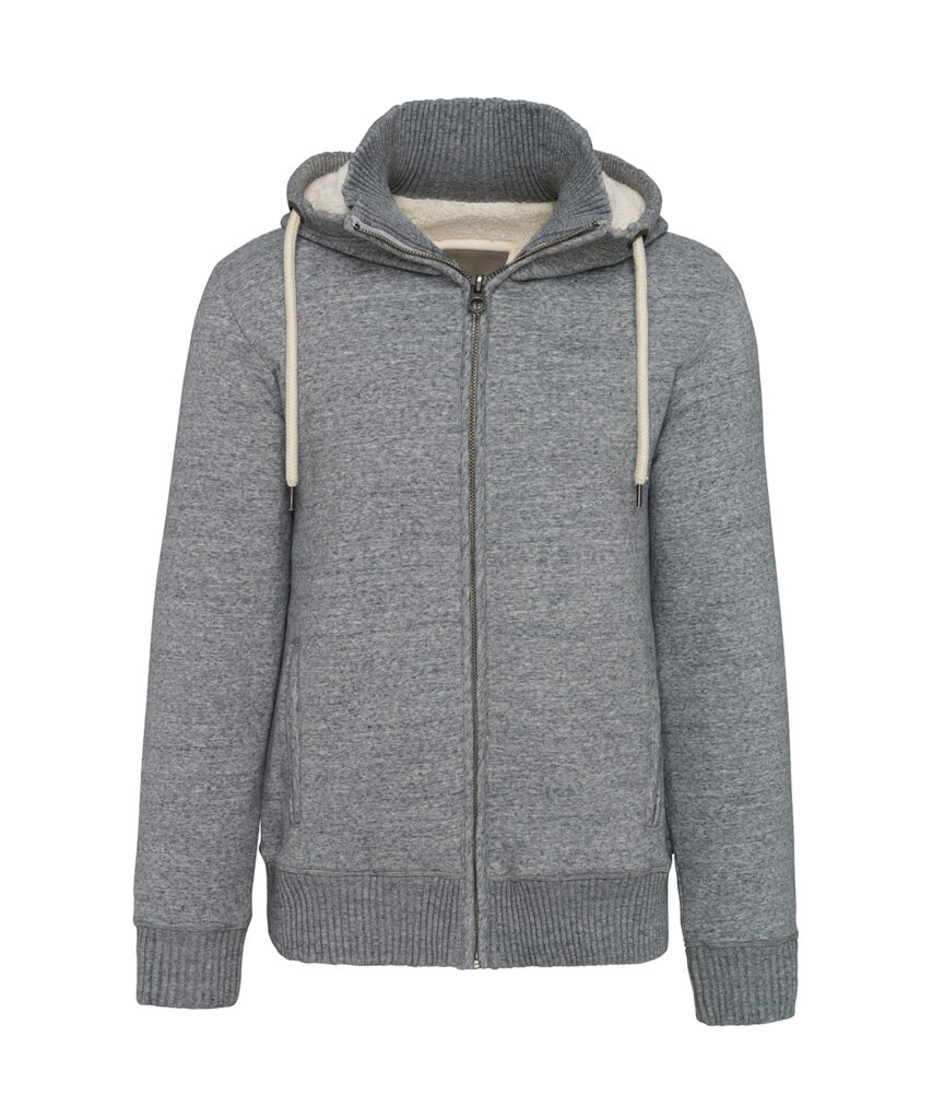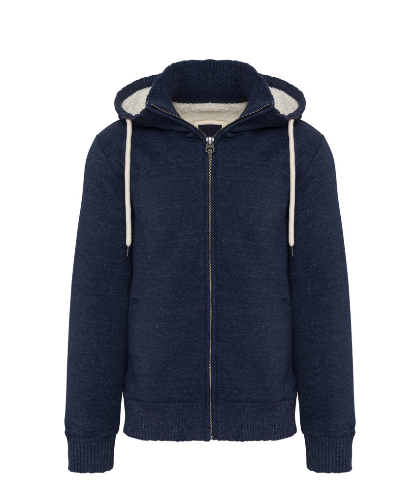 80% cotton / 20% polyester. 100% Polyester fully sherpa-lined. 2 piped front pockets. Metal zip fastening. 4×4 ribbed neck, hood edge, cuffs and hem. 2 invisible zippers on left chest and left seam for decoration access. This product has been specially treated and appears intentionally aged. This manufacturing process results in colour variations between products and makes each piece unique. No brand label at neck, only size tag for easy relabelling. Certified STANDARD 100 by OEKO-TEXN CQ1007/7, IFTH.