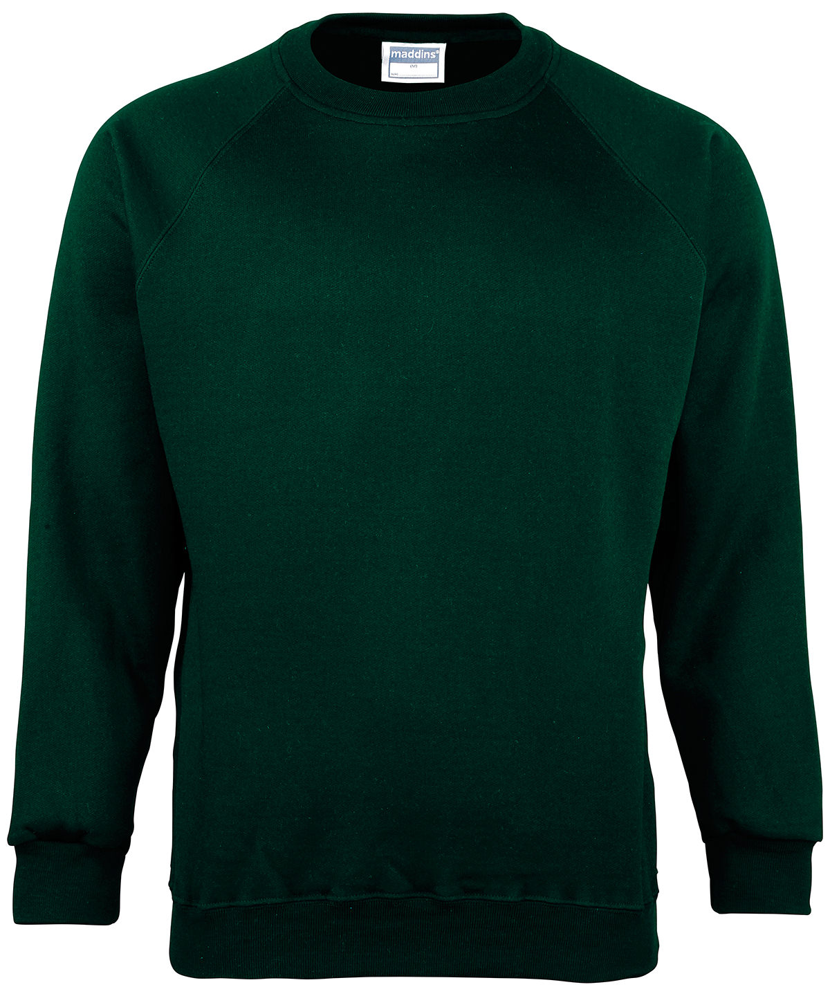 Easycare crew neck raglan sleeve sweatshirt with coverseam finish around neck, welt and raglan. Herringbone taped neck. Woven label.