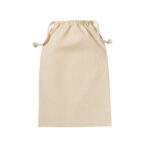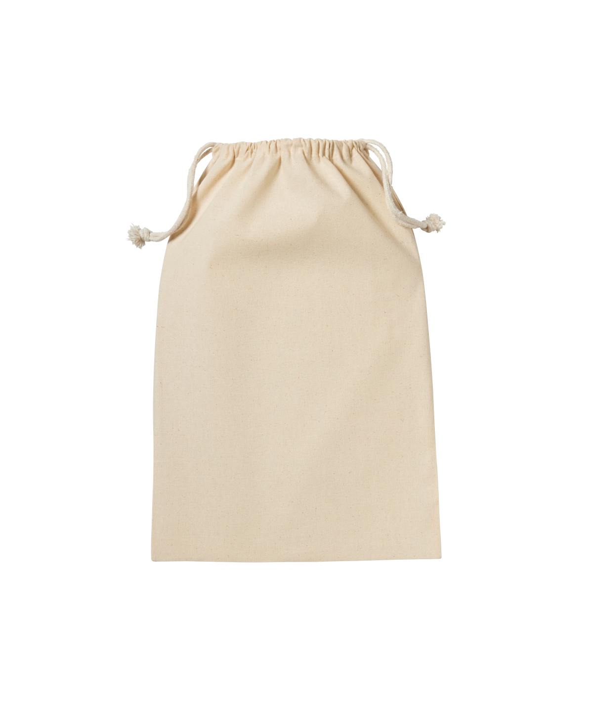 Stuff bag made from recycled cotton. Double drawcord closure. 150gsm. Natural pull ties.