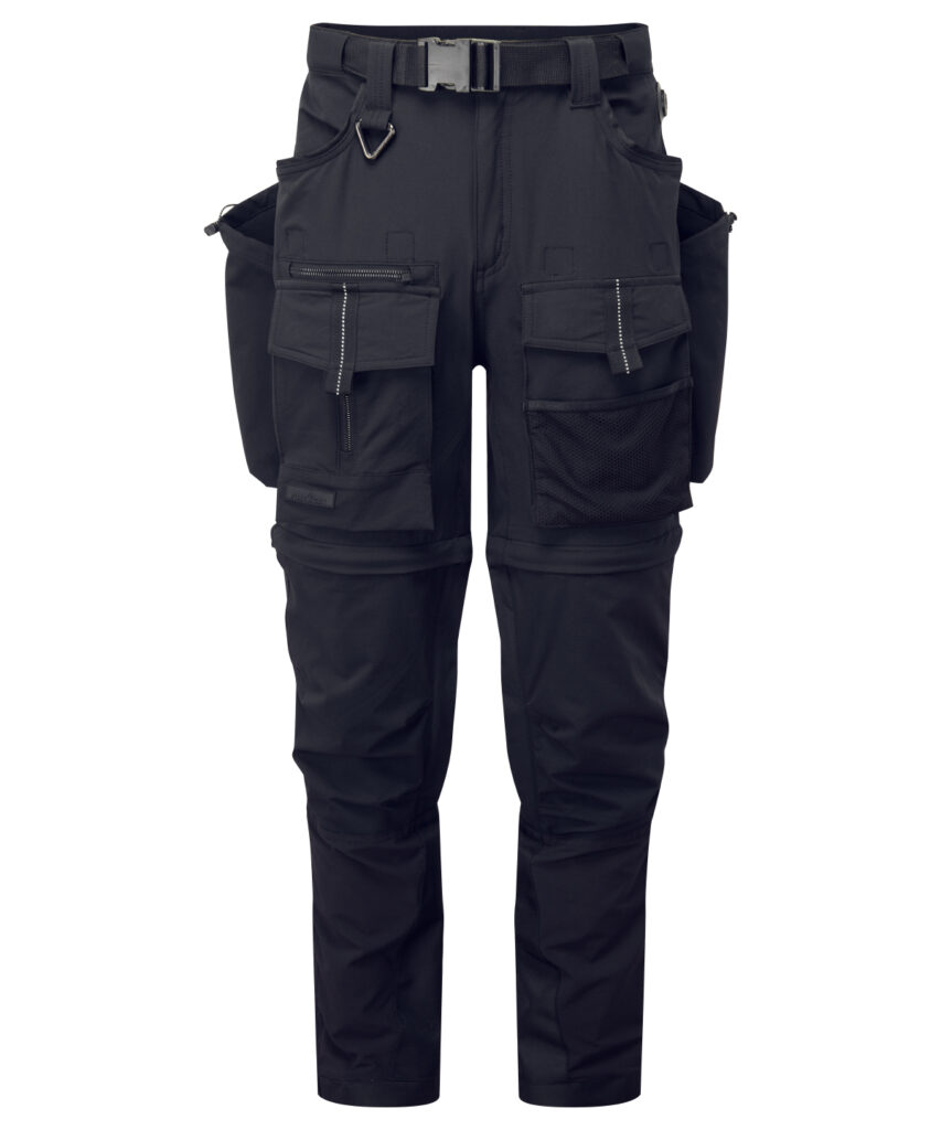 The Ultimate modular 3-in-1 trouser design for your every need. The 3-in-1 design converts a work trouser to a work short or a EN20471 Class 1 work trouser. You have every thing you need. Pockets with magnetic flaps so they don’t get in the way, kneepads pockets, large built-in side pockets for large tools, spray cans or just fold up the legs when in shorts mode and keep them safe. Built-in waistband, front of leg cargo pocket for easier use when working, with a mesh mobile phone pocket. Plus the unique clip on pocket system with the use of three pockets that can clip on the front or the back of the trouser.