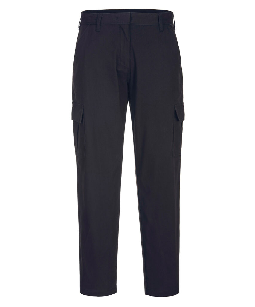 This womens slim fit stretch cargo is the perfect uniform solution, offering a contemporary slim fit in a dynamic cotton stretch twill fabric. The stretch fabric provides the ultimate in comfort and freedom of movement. Features include side pockets, a rear buttoned jetted pocket and a hook and bar waist fastening. Highly durable with twin stitching throughout and bar-tacked at all stress points.