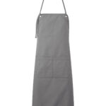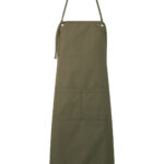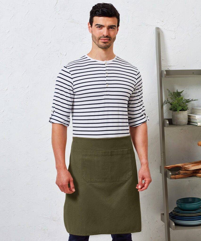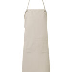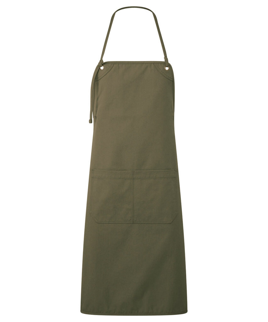 Heavyweight canvas bib apron that can also be folded down to form a half-waist apron. Rounded edges. Gunmetal/antique brass eyelets. Mitred double pocket. Adjustable knotted neckband and matching waist ties that can be fastened to the front or back. Cotton-rich with recycled polyester. Sedex certified.