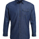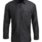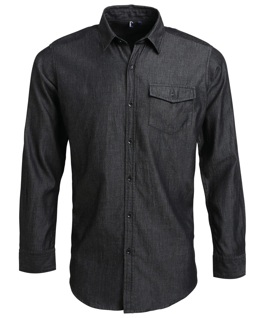 Long sleeve denim shirt with contrast stitch detail with left breast pocket. Buttoned cuff and sleeve guard. Curved hem. Back yoke. WRAP certified. BSCI certified. Reach certified. SEDEX certified.