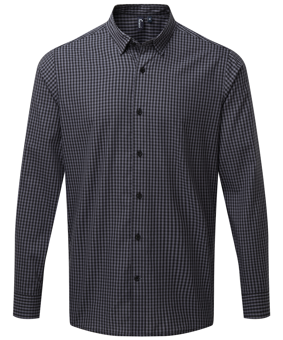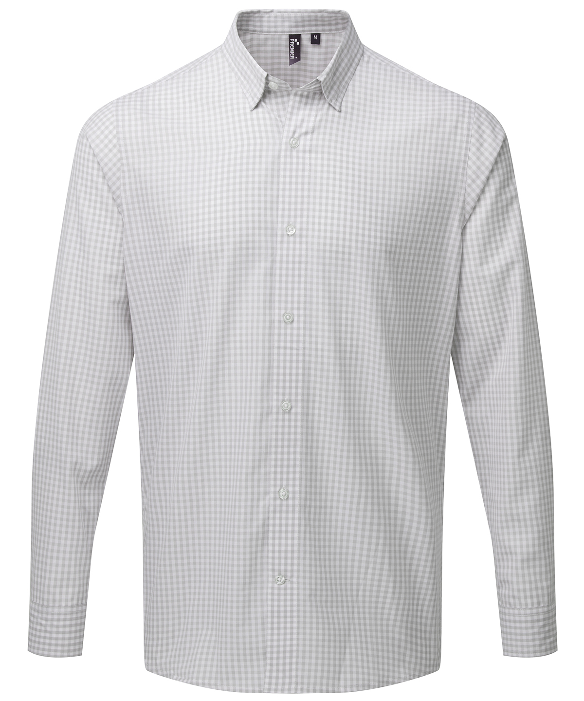 Yarn dyed fabric creating a gingham pattern. Long sleeve with single button cuff and sleeve guard. Narrow soft collar with button-down options on the underside. Semi fitted. Easycare fabric. WRAP certified. Reach certified. BSCI certified. SEDEX certified.