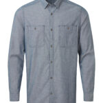 A chambray finish complements this Fairtrade organic cotton mens shirt. Twin-needle stitching features across the style from the cuffs and sleeves, through to the collar, placket and chest pockets.? Two button-down chest pockets add to the overall aesthetic of the shirt, together with a button down collar to the underside. ?A single button features on the back of the collar to secure an apron neatly in place.
