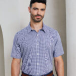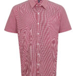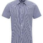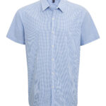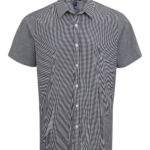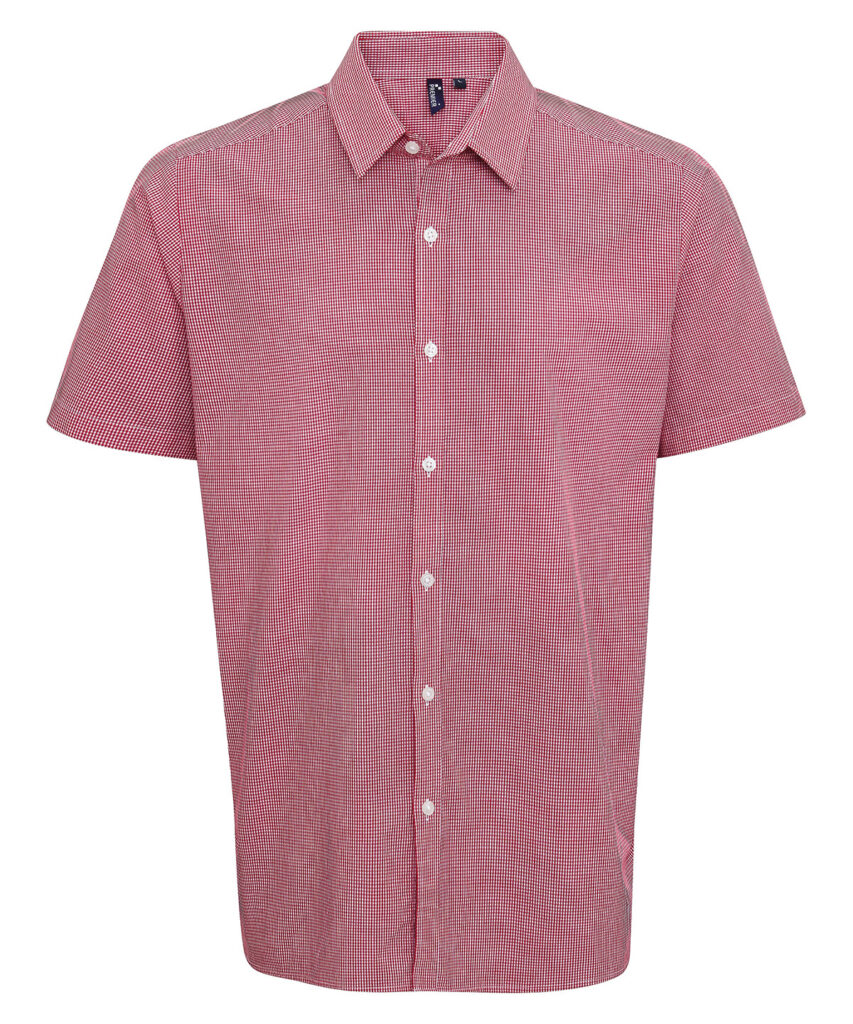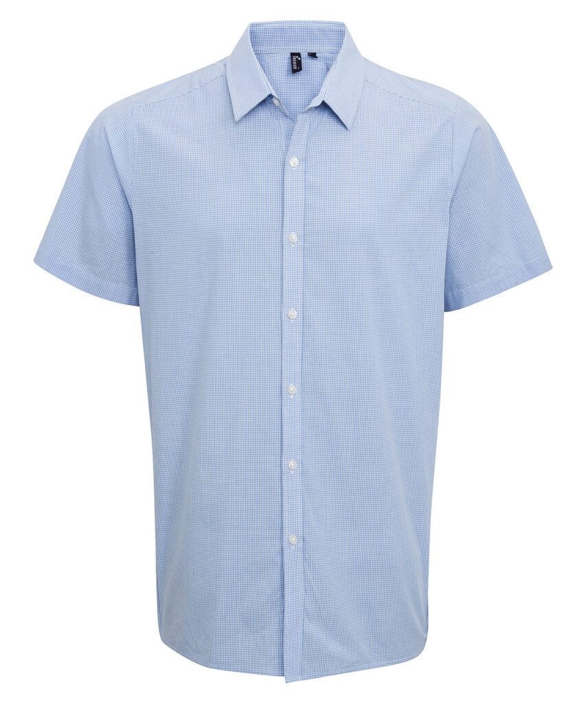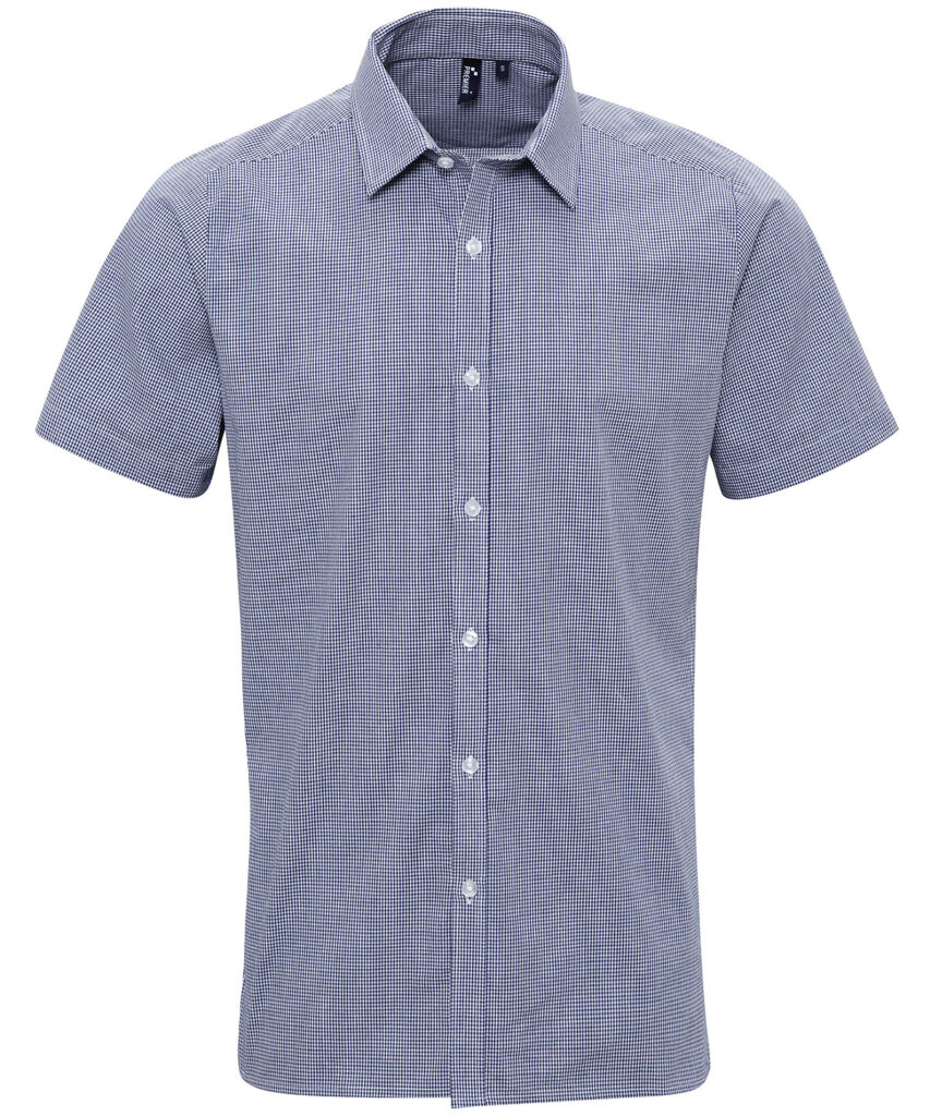 A short sleeve shirt with soft collar styling. Two colour Microcheck gingham style pattern. Semi-fitted styling. WRAP certified. BSCI certified. Reach certified. SEDEX certified.