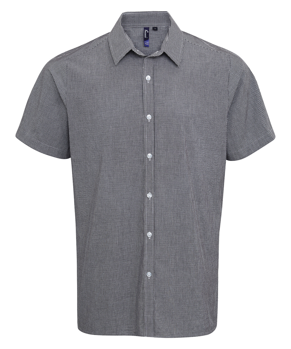 A short sleeve shirt with soft collar styling. Two colour Microcheck gingham style pattern. Semi-fitted styling. WRAP certified. BSCI certified. Reach certified. SEDEX certified.