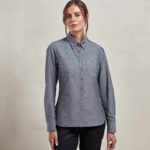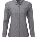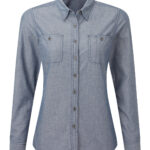 A chambray finish complements this Fairtrade organic cotton womens shirt. Twin-needle stitching features across the style from the cuffs and sleeves, through to the collar, placket and chest pockets.? Two button-down chest pockets add to the overall aesthetic of the shirt, together with a button down collar to the underside. ?A single button features on the back of the collar to secure an apron neatly in place.