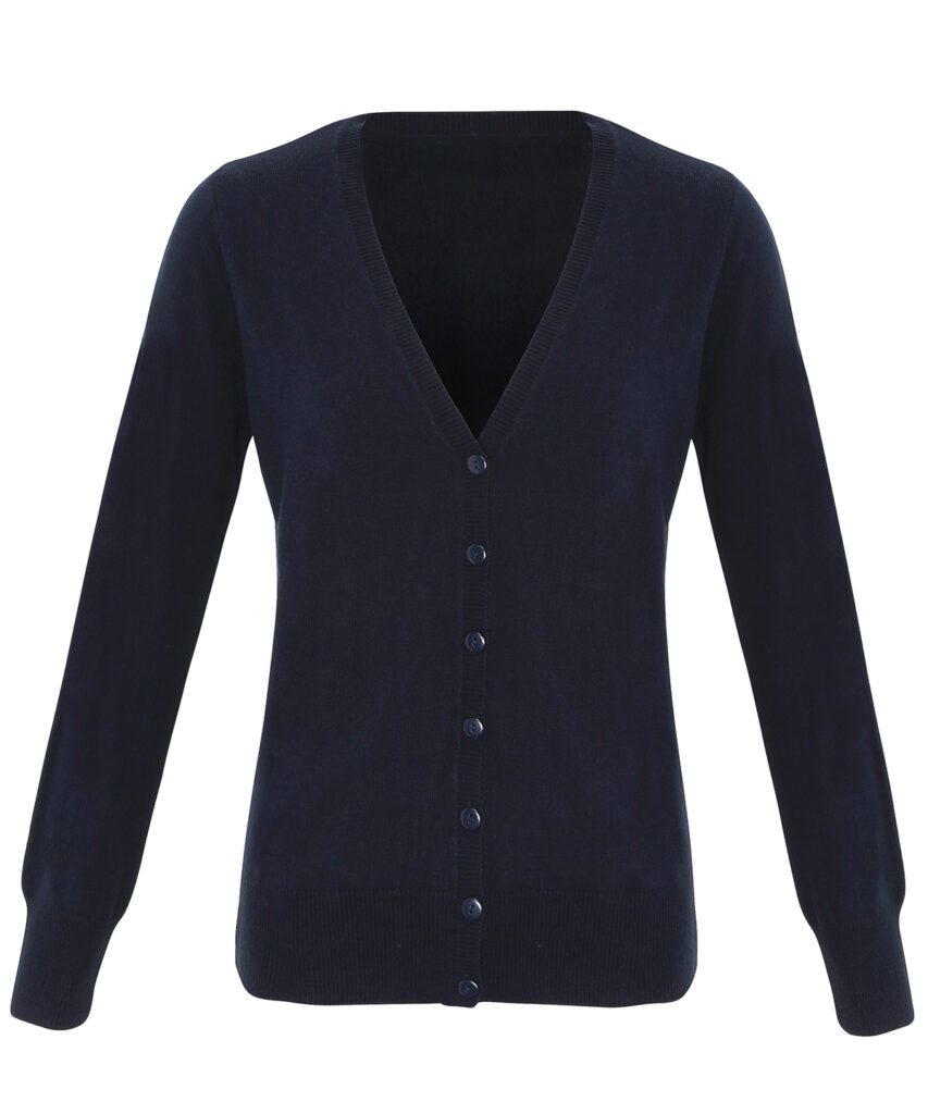 A simple easy wearing cardigan for ladies that adds layers of style to your outfit. Designed with ribbed knit set-in sleeves, hem line and v-neck for a contemporary modern look. Self-coloured button through style. A wardrobe essential for staff who need to maintain a smart corporate image at all times. WRAP certified. BSCI certified. Reach certified.