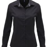 Introducing our ladies Friday shirt designed for a modern look for bar staff and for those more casual dress-down days in the office. A fitted shirt with soft collar styling with a contrast neckband which is visible when wearing as open neck. Theres a single button sleeve placket that allows you to un-do and create a cool roll-back look on the lower arm. A curved hem, bust and back darts make for a flattering fitted blouse for women.