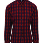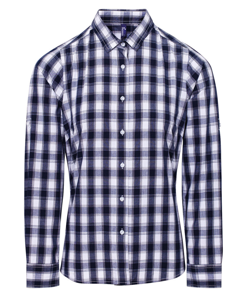 A women’s long sleeve semi-fitted shirt with multi-coloured contrast check pattern. Single button cuff and sleeve guard which is designed to be rolled up and secured in place with a button and tab on the upper arm. Soft collar styling with curved hem. WRAP certified. BSCI certified. Reach certified. SEDEX certified.
