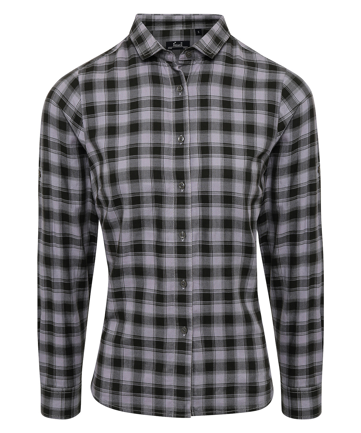 A women’s long sleeve semi-fitted shirt with multi-coloured contrast check pattern. Single button cuff and sleeve guard which is designed to be rolled up and secured in place with a button and tab on the upper arm. Soft collar styling with curved hem. WRAP certified. BSCI certified. Reach certified. SEDEX certified.