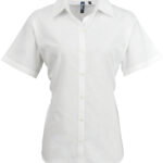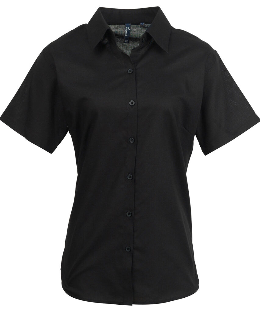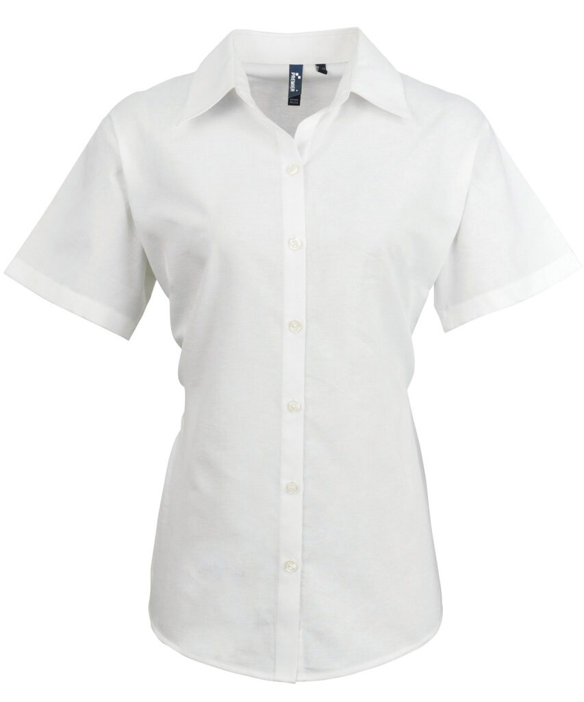 Ladies signature Oxford short sleeve blouse with wrinkle free finish for a smart and professional appearance. Soft collar styling. Rounded bottom hem. Fitted styling with bust and back darts. Pearlised buttons on light blue and white shirt, self colour buttons on remaining. Made from OEKO-TEX Standard 100 fabric. WRAP certified. BSCI certified. Reach certified. SEDEX certified.