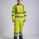 Certified EN ISO 20471:2013+A1:2016. RIS-3279-TOM ISSUE 1:2016 (Orange only). HV Orange/Navy & HV Yellow/Navy – Class 3. Ribbed contrast colour collar. 3-button placket, contrast colour buttons plus 1 spare. Twin-needle stitching on shoulder. Twin-needle stitching on sleeve and bottom hem. Side seam vents. Over shoulder and around body reflective tape. Around body tape finishes before the side seam for comfort and ease of fit.