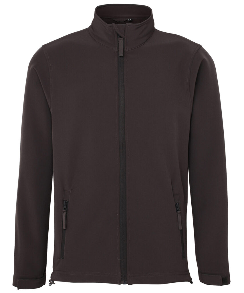 Two layer bonded softshell jacket with full zip front fastening. Relaxed fit. Two front zipped side pockets. Chin guard with internal storm flap. Adjustable shockcord hem. BSCI certified. SEDEX certified.
