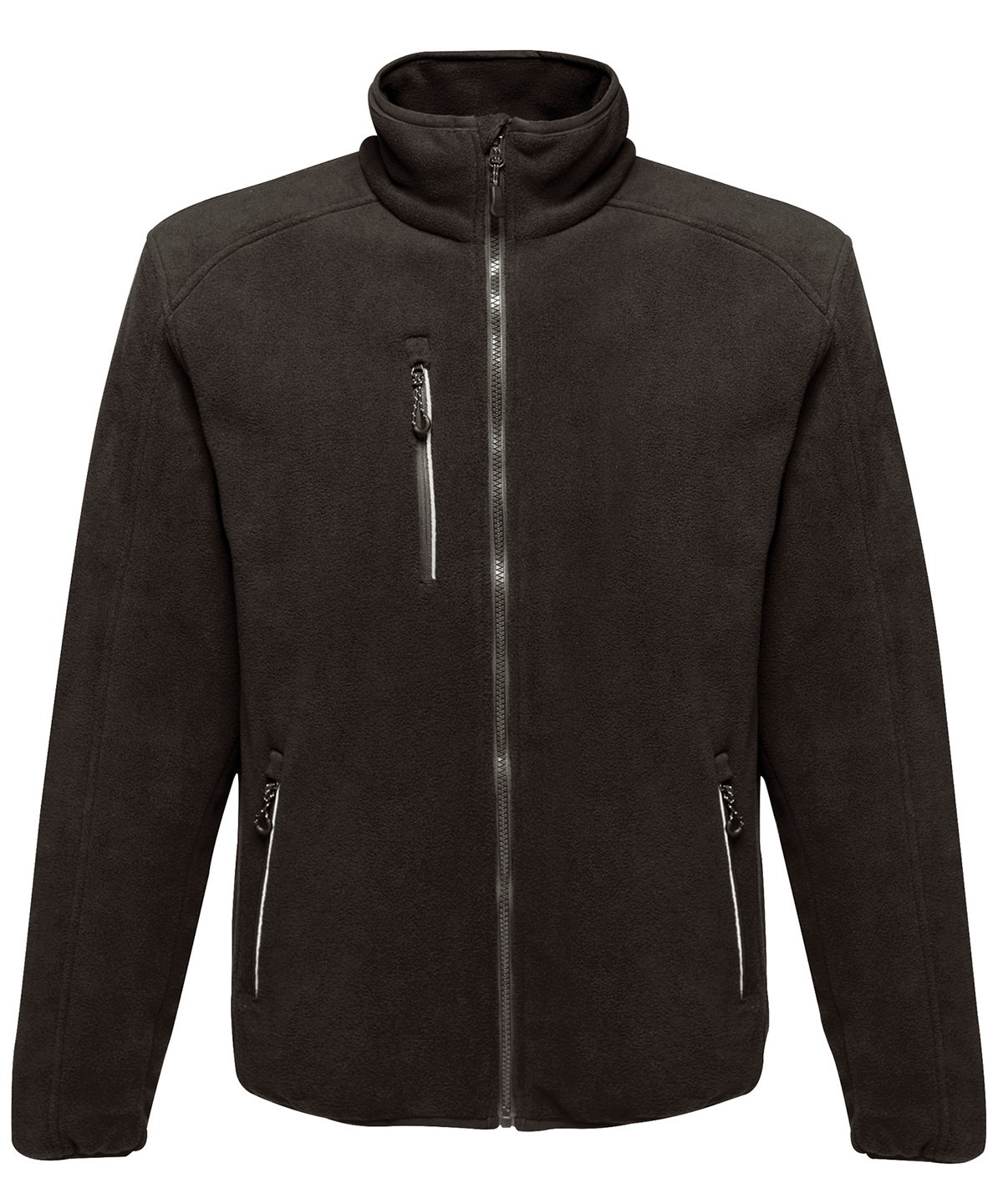 2 zipped lower pockets and 1 chest zip pocket with inner concealed zip in lining for embroidery access.