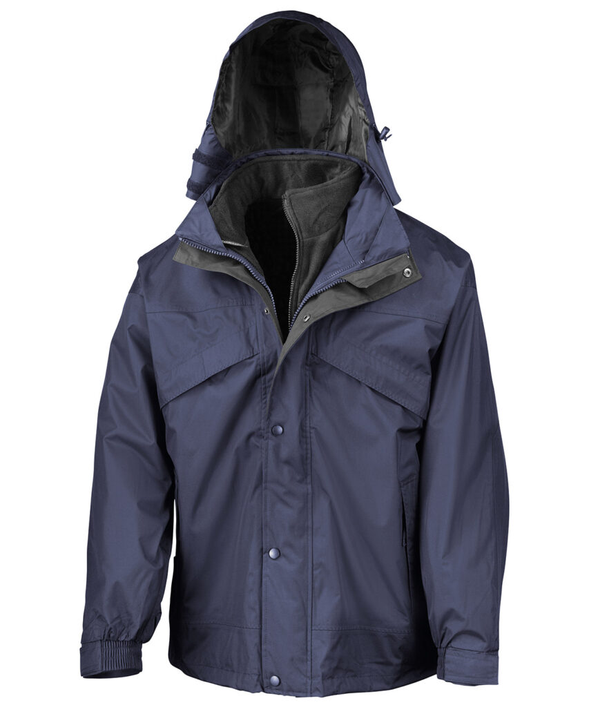 Double stitched taped seams. Concealed fully featured hood in collar with chin guard and shockcord adjuster. Full front heavy duty 2-way zip fastening. Zip and clip system for attached to inner jacket. 2 spacious side pockets and 2 spacious chest pockets. Elasticated cuffs with tear release adjusters. Adjustable shockcord hem and stud closing double storm flap. Underarm ventilation eyelets. Wrinkle/crease resistant fabric. High zip through collar with shockcord adjusters. Stud closing double storm flap. Inner jacket. 2 spacious side pockets. Full front zip fastening. Elasticated cuffs. Contains recycled material.Decoration Guidelines:Decorating methods: Outer: Embroidery, Transfer print & Screen print transfer. Inner: Embroidery & Transfer print. Decorators access point: Concealed Inner back & left chest zips.