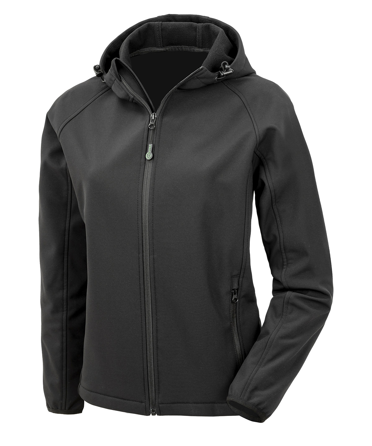 A great-fitting, clean-looking and durable hooded womens softshell made from recycled fabric.