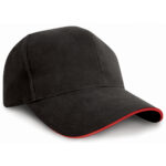 6 Panel. Full profile. Laminated cotton support backing to front panels. Pre-curved peak with 8 stitch lines. Stitched eyelets. Contrasting colour sandwich peak. Fabric size adjuster with antique brass buckle.Decoration Guidelines:Decorating methods: Embroidery. Decorators access point: Open.