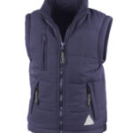 Water repellent. Windproof. Horizontal quilted outer. Concealed hood in collar with tear release fastening. Full front zip fastening. 2 angled front pockets and 1 chest pocket. Snug-fit elasticated arm holes. Reflective hang tag and triangle incorporating 3M Scotchlite reflective materials. Contains recycled material.Decoration Guidelines:Decorating methods: Embroidery, Direct print, Transfer print & Screen print transfer. Decorators access point: Concealed zips in outer shoulder panel & Inner side seam.