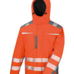 Tricot lined hood in collar with tear release fastening. Reflective detail and diagonal print to body and sleeve. Heavy duty 2-way zip with studded outer storm flap. Inner storm flap with chin guard. Adjustable shock cord hem. Contrast grey tricot lining. 3 zipped outer pockets. 2 inner pockets. Inner storm cuff. Stand up collar. Hangtag. Tough and hardwearing look. Ready to brand – cutaway label. EN ISO 20471:2013 Class 2; GO/RT 3279 Issue 8:2013 Class 2 (Orange). Oeko-Tex certified.