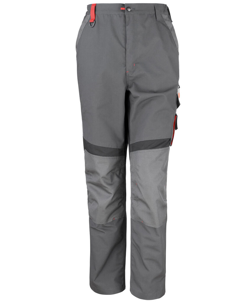 Front zip with rivet fastening. Knee pad pockets. 2 side pockets. Left thigh phone pocket and zip pocket. Cargo multi-use tool pocket. Elasticised waistband. Rear pockets. Belt loops. Reinforced seams with bar tacked pockets and stress points. Triple stitched seams. Decorative reflective stripe. Strengthened contrast knee fabric. Tricot waistband for comfort feel inner. Comfort fit. Highly durable fabric. Expansion waistband allows for adjustable fit and draught protection. Highly technical. Fantastic price point. Black contrast panels and red stitch detailing. 2 trouser turn-up for lengthening if required. Unisex fit. Windproof.Decoration Guidelines:Decorating methods: Embroidery. Decorators access point: Open. Oeko-Tex certified.
