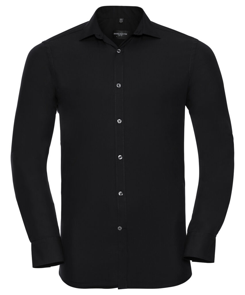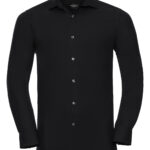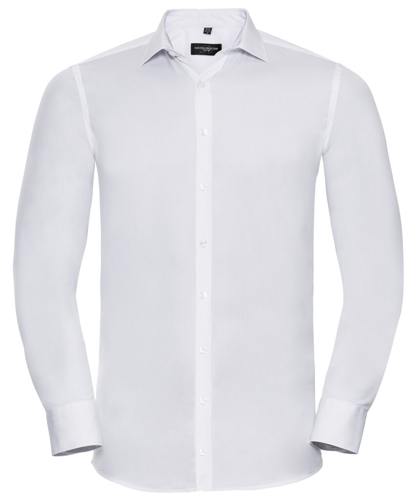 A unique and subtle comfort stretch from this advanced Elastomultiester Lycra T400 fibre fabric creating a premium shirt that stays looking crisp and sharp all day long. Excellent shape retention for a lasting fit. Moisture management for cool comfort. Durable fabric. Fitted fit. Short leaf, semi cutaway collar. Narrow placket. Darts at back. Square edged cuffs. Cuff link options. BSCI certified.